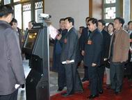 Delegates attending the opening of second session of the 10th Chinese People's Political Consultative Conference pass the security check point at the Great Hall of the People in Beijing, March 3, 2004.