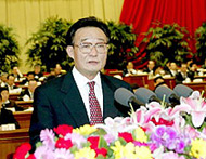 Wu Bangguo, chairman of the Standing Committee of the National People's Congress, delivers a report on the work of NPC in the Great Hall of the People on March 10, 2004. NPC deputies will also hear work reports from the Supreme People's Court and Supreme People's Procuratorate Wednesday afternoon.