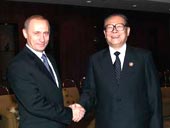 | Chinese President Jiang Zemin (R) meets with Russian President Vladimir Putin in Shanghai on Saturday, October 20, 2001. (10/20/2001) |