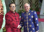 | Chinese Prsident Jiang Zemin and Indonesian President Megawati Soekarnoputri in Chinese-Style Costumes.(10/21/2001) |