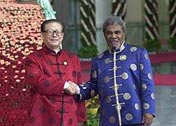 | Chinese Prsident Jiang Zemin and Papua New Guinean Prime Minister Mekere Morauta in Chinese-Style Costumes.(10/21/2001) |