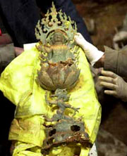 “According to an inscription on a stone tablet uncovered early this year, the iron case in the underground palace contains the hair of Sakyamuni, the founder of Buddhism,” said Cao Jinyan, director of the Cultural Relics Archaeological Study Institute of Zhejiang Province.