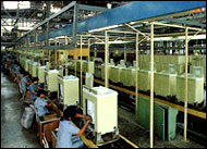 A pair of sportshoes costs five dollars after the production process in eastern China. However, the price rises to 150 dollars when a foreign label is stuck to it.