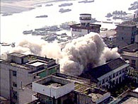 Boom! Boom! Boom! A series of explosions blasted away a building in the reservoir area of China's Three Gorges Project at 13:40 hours Sunday, marking the start of the countdown to water storage and power generation at the Three Gorges Project.