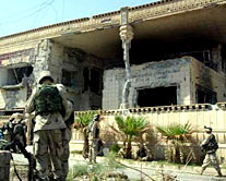 US soldiers at the battered hulk of the once imposing concrete villa said a barrage of rocket and machinegun fire had been aimed at the residence. Four US troops were wounded.