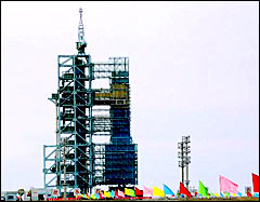 A "Long March" II F carrier rocket stands at the launch pad in the Jiuquan Satellite Launch Center in Gansu Province, northwest China.