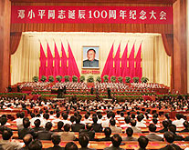 Hu Jintao, state president and general secretary of the Communist Party of China Central Committee, delivered a speech at the meeting. Hu described Deng Xiaoping as a great man of the world whose scientific judgment of the modern times and deep vision into the international situation provide a basis for China's domestic and foreign policies.