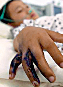 Burnt by the liquid that spilled on his leg, the boy threw the 50-centimeter-long tube to the ground. The liquid splashed onto his fingers and legs.
