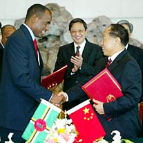 At the invitation of the Chinese government, Prime Minister Roosevelt Skerrit of the Commonwealth of Dominica paid a working visit to China recently. Foreign Minister Li Zhaoxing and Skerrit, on behalf of each government, signed a joint communique on the establishment of diplomatic ties in Beijing on March 23.