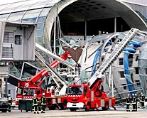 A few cracking sounds as a 30-meter portion of the concrete, steel and glass roof caved in just before 7 am (0500 GMT) at the Terminal 2E of Paris Charles de Gaulle airport as passengers arrived Sunday morning. Tons of concrete and metal fell to ground and were scattered over an area of about 50 meters by 30 meters.