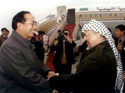 | A file photo shows Zhao Qizheng (L), then deputy mayor of Shanghai and current minister of the State Council Information Office, hand in hand with Yasser Arafat . The file photo was taken in 1991 at Shanghai's Hongqiao Airport. (Photo source: China Daily) |