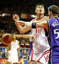 Playing at his hometown for the first time since joining the Houston Rockets during the 2002-2003 season, Yao seemed slightly nervous at first before the capacity crowd of more than 10,000. But the 2.26-meter center soon found his rhythm and scored his first basket four and a half minutes into the game, dunking on Tracy McGrady's assist.