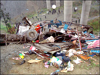 Police said the bus was torn apart in the fall and 25 people were killed instantly, including the driver. Two others died later, one on his way to a nearby hospital and the other in the emergency room.