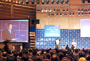 The opening ceremony of 2005 BFA annual conference was presided by BFA General-Secretary Long Yongtu. Chairman of the BFA board Fidel Ramos delivered a welcoming speech. The theme of the annual event is Asia Searching for Win-Win: New Role of Asia.