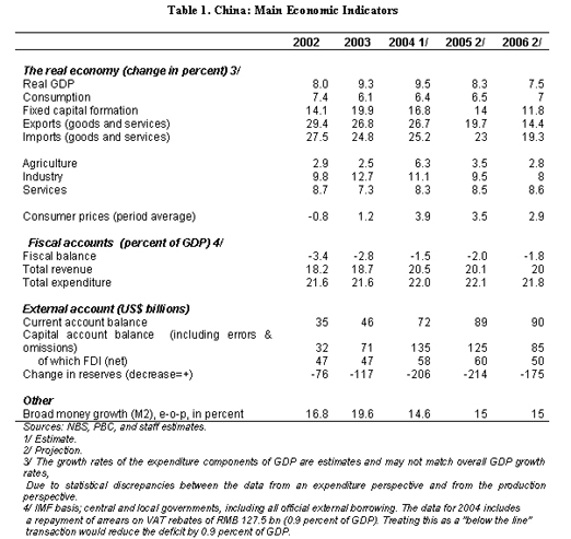 The macroeconomic outlook for 2005 remains favorable. Although world growth is likely to come down from the record 3.8 percent in 2004, with 3.1 percent it is still above trend. World trade is expected to grow by 7.7 percent, 2.5 percentage point below 2004 growth. On the back of moderate credit growth and sliding profitability, domestic demand is likely to ease, although it remains robust. We expect moderate underlying inflation pressures, and strong fiscal and external positions. The authorities' (indicative, non-binding) targets for 2005 are a GDP growth rate of 8 percent and average CPI inflation of 4 percent. We project GDP growth of 8.3 percent and average CPI inflation of 3.5 percent, recognizing that the newly released data suggests upward risk to our projection (Table 1).