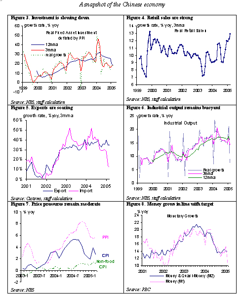 Domestic demand is cooling down, but external demand keeps GDP growth high. Real fixed asset investment (FAI) growth was 17.2 percent year-on-year (yoy) in the first quarter of 2005, which is down from 24.9 percent in the year 2004, although up from the 15.5 percent in the final quarter of last year. Investments are shifting away from sectors previously considered as overheated such as steel and cement. Retail sales growth is gaining momentum, although consumption growth is still likely to lag GDP growth for the year. Tax revenues also suggest slowing in domestic demand, and trade data confirm this trend. At the same time, the rising trade surplus is boosting industrial production and kept GDP growth rate at 9.5 percent in the first quarter, the same as that in the fourth quarter of 2004.