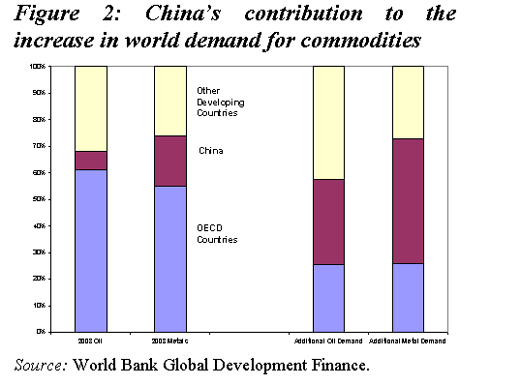 China's terms of trade deteriorated further in 2004. Their deterioration by about 5 percent translated in a 1.5 percentage point of GDP purchasing power loss. This was in spite of an increase in export prices of 5 percent in 2004. However, import prices, notably commodity prices, rose more rapidly, and China's appetite for commodities was contributing to this trend. Although China's share in the world demand for oil (7 percent) and metals (19 percent) is still modest, the countrie's take in the additional demand is high: about 1/3 of additional oil demand and almost half of additional metals demand in 2004 (Figure 2).