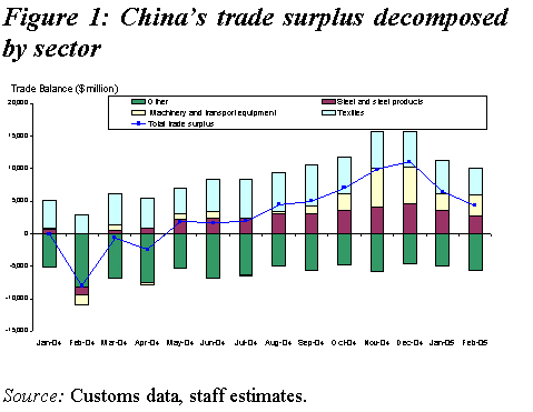 The turnaround in trade flows was particularly pronounced in basic materials (Figure 1).[1] Domestic demand for these products cooled off as sectors such as construction and cars were affected by the policy tightening, and, in the case of cars, by the prospects of reduced tariffs next year. In contrast, production capacity had expanded rapidly due to high investment in previous years. For example, crude steel output capacity will have increased about 40 percent between 2003 and 2005. With strong incentives to sell abroad, these industries suddenly turned from net importers into large net exporters. A more secular improvement in the trade balance of "machinery and transport equipment" (SITC 7) is related to the rapid development of the electronics industry in China. Sourcing an increasing share of components from domestic suppliers, this sector contributed over one-quarter to the total turnaround. The increase in textile exports after removal of the Multi-Fiber agreement has made a more modest contribution. In fact, growth in textile exports is lagging that of overall exports, and China's trade surplus in this sector declined in the first few months of the year. But in markets previously protected by the Multi-Fiber Accord, China's market share still grew rapidly.