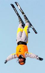 In aerials, skiers hit the jumps or kickers at speeds of 60+ kmph and soar up to 50 feet in the air while performing somersaults and turns, landing on a steep landing hill.