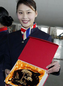 Also making a debut were souvenirs the company has specially prepared for the flights, including ceramic bowls and tigers and perfume pouches.