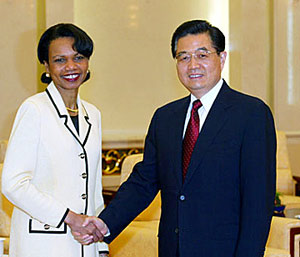 Rice spoke highly of China's important role in the progress of the talks and briefed Hu on US viewpoints on this matter. She reiterated that the US also regarded the six-party talks as the best way to solve the issue.