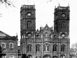 The embossment around the arched gateway of the church is still telling religious stories after nearly a hundred years. The two belfries stand upright among green trees, and images portraying biblical stories on the arched doorway and windows are faintly visible.
