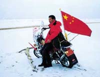 Testimony to the hardship of this, the most difficult leg of his whole journey: the windshield on the motorbike is broken and the on-board thermometer has stopped working. It gave up the ghost at 25 degrees below zero. Tired and frozen as he is, Wang, slow and hesitant, talks to the reporters.
