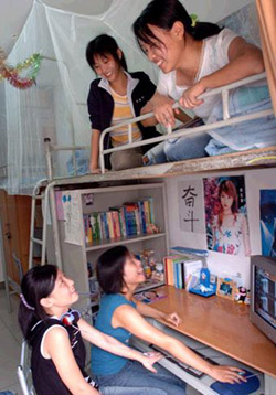 In recent years there is a marked improvement in the quality and facilities of college dorms. The ones in Guangzhou's new college town take in only four to a room, all with air-conditioning, shower and toilet. Each person has his or her own desk and cabinet.
