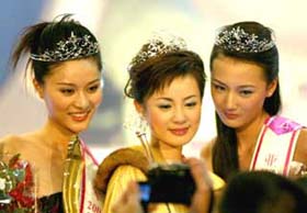 Lu Jingjing (center), Lan Lan (right) and Chen Lanfang (left) are crowned in the China contest for Miss Asia pageant in Hangzhou, east China's Zhejiang Province September 28, 2004.