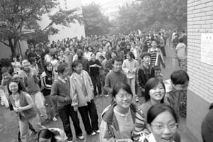 About 200 students from Jianxin Middle School in Chongqing Municipality stood in front of a supermarket at 7:43 AM on Saturday in protest at their school holding classes on weekends.