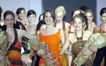 Winner Sofie Oosterwaal (R) of the Netherlands, first runner-up Dana Marcolina (C) of the US and second runner-up Maj Bjerre of Denmark pose after the Elite Model Look 2004 International finals in Shanghai, December 2, 2004. Some 80 contestants from 50 countries competed in the Elite Model event, the first time it was held in China.