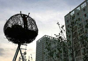 A man-made nest has been placed on a 10-meter steel shelf on the Jianwai SOHO Plaza, the most prosperous business area in Beijing. Chinese poet Yefu moved into the nest yesterday, where he will experience a bird's life for one-month.
