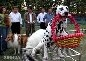 A dalmatian dog performs at a competition during a dog fair in Nantong, Jiangshu of east China, April 27, 2005. Some 100 dogs attended the fair. The "winners" will perform for tourists during the upcoming May Day holiday.