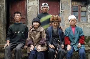 Zhu Yingzhou (2nd R) and his wife Xiong Fazhen (2nd L) pose for a photo with their youngest son, 51-year-old Zhu Yiming (L), daughter-in-law (R) and grandson in the village of Fengtang in Qingzhen city in southwest China's Guizhou province May 24, 2005.