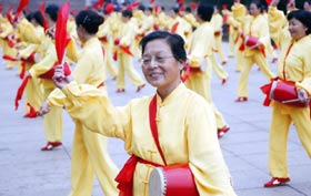 Elderly women perform traditional waist-drum in a park in Changsha, capital of central China's Hunan Province in the morning of Oct. 20, 2002. Residents have a better taste of their life and public recreation activities become more popular nowadays.