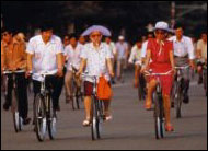 The current cycling vogue means that middle school students aspire to ever better, and consequently expensive, bikes. Super top-of-the-market cycles going for 1,000 yuan or more are such a prize possession that in order to gain face, young riders from low income households have been know to stick the labels of super cycles like Campagnolo, Tektro and Continental over those of their less exalted brands. One 13-year-old boy confesses: "I was heartsick and envious at the sight of my classmates on their stylish bicycles, but my parents wouldn't buy me a new one until I promised to get better grades." In a bid to check this trend, students at No.15 Middle School in Taiyuan, Shanxi Province were recently prohibited from riding bicycles on campus that cost more than 300 yuan.