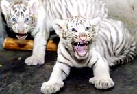 Two 2-month-old white tiger cubs born in the Wild Animal Zoo in Hangzhou, the capital city of east China's Zhejiang Province, face strangers for the first time yesterday.