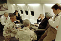 Rumsfeld flew in Baghdad on Thursday on a previously unannounced visit to discuss with his top military brass a new security plan which is aimed at cutting US losses by enlisting multinational peacekeepers to Iraq without abandoning US overall control.
