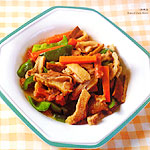 2. Heat 75 g (4 1/2 tbsp) of oil to 180-200oC (355-390oF) and stir-fry the duck shreds. Add the cooking wine, salt, water, green peppers, carrots and ham, and cover the lid to cook for 5 minutes. Take off the wok lid to reduce the liquid. When the liquid becomes thick, add the mixture of cornstarch and water. Sprinkle on a few drops of sesame oil and turn over several times. Now serve.