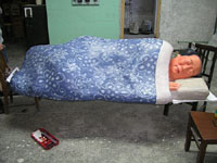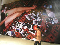 Following the overall theme, artist Yin Xiuzhen has installed a beautiful, spectacular work entitled Weapons. More than 100 model television towers, made with bamboo poles and plastic basins and wrapped with colourful cloth, hang horizontally from the roof to the ground. Sharp knives are attached to one end of the poles and thus the television towers are turned into weapons.