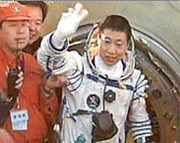 At 6:15 am Wednesday, Yang got seated in the re-entry module of Shenzhou-5, atop a 58.3-meter-high Long March-II-F carrier rocket. Between 1999 and 2002, Long March-II-F carrier rockets were used to launch four unmanned spacecraft into orbit, and all the launches were successful.