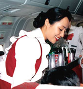 What Wu Eryu had formerly dealt with were spinning machines in workshops. Today, on the other hand, she deals with passengers on airplanes. For a woman in her 30s, the road to being a qualified stewardess was not easy. She had to study hard from the very beginning. The vocational training program which consisted of 13 courses, including figure building, air-attendant theory, behavioral norms, Mandarin, and English, was the toughest task she had ever undertaken. For six months, Wu Eryu studied almost all day and night, and was eventually conferred a stewardess's license by the Civil Aviation Administration of China.