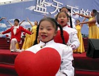 Children sing during the charity performance held to aid the needy families in Shanghai January 26, 2002. Over ten thousand volunteers participate the campaign that aims to help some 10,000 families during the Spring Festival, the most important holiday for Chinese.