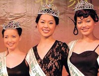 Shirley Xue, center, 28, smiles as crowned Miss Chinese International Beauty on Sunday in Guangzhou. Beside her are first and second runner-ups, Christie Angela, left, and Angela Foo.