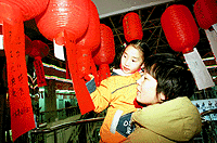 On the photo, Han Xue, a ten-year-old girl, with her mother reads the riddles written on cards under the lanterns in Changchun, capital of the northeast China’s Jilin Province February 7, 2001 during the celebration of the Lantern Festival.