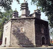 The multiple pagodas on one pedestal, a vajrasana, were built of stone and brick in 1494 in the Ming Dynasty. The whole complex is some seventeen meters high. The octagonal pedestal is huge. Its walls are plain and flat; except for niches for statues of Buddha they have no carvings. There are arched doors on four sides of the pedestal, and a horizontal stone over the front door carries the pagoda's name. In the center of each side is a niche with a white marble statue of a seated Buddha. Around the top of the pedestal are narrow pent roofs. The five pagodas stand on top of the pedestal; the one in the middle, a dagoba in the shape of an inverted bowl, is bigger than the other four, which are multi-eaved, solid, hexagonal pagodas. The pagodas all have their own Sumeru pedestals with elaborate carvings, the white pedestals in sharp contrast to the dark-gray bodies of the pagodas. One of the pagodas bears a small stone tablet that carries the date of the pagoda's construction.