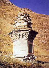 Monk Gaogong Pagoda is a single-storeyed, pavilion-style, ornamental brick pagoda located northwest of Foguang Temple. It is about five meters high. The lower part is a relatively tall pedestal. Both the pedestal and the upper part are octagonal. There are many layers of brackets made of carved bricks under the pent roof around the body of the pagoda. The eaves consist of three layers of bricks in chevron design. The brackets and eaves, large in proportion to the main body of the pagoda, look like an umbrella above the lower part. The upper structure of the pagoda is composed of five levels of lotus petals, eight in each level, like a huge bouquet of lotus flowers. Supporting the bouquet is an octagonal subbase. The bouquet is about one third the pagoda's height. The top of the pagoda is composed of several layers of bricks stacked towards the center. In the past, the pagoda probably had a brick bead on the top, but it has been damaged.