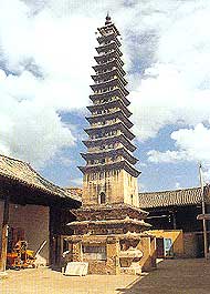 Located at the backyard of Huangge Garden in Jianshui, the pagoda is also known as Wenchang Pagoda and Wenfeng Pagoda. Built in the thirteenth century during the Yuan Dynasty, the pagoda underwent several repairs in the Ming and Qing dynasties, but it retains the Yuan style and some original component parts. This square, multi-eave, brick structure has thirteen storeys. The base of the pagoda is formed by a huge Sumeru pedestal of four layers, making it look solid and majestic. The main body tapers sharply and the whole pagoda is elegant. Crowned by a square pavilion on top, it is another example seldom seen among Yuan Dynasty pagodas.