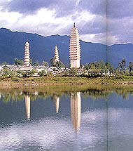 The three pagodas used to be situated in Chongsheng Temple at the foot of Diancang Mountain on the shores of Lake Erhai. The temple no longer exists, but the three pagodas, different in size and history, remain. Qianxun Pagoda, the biggest of the three, is described variously in historical records, but from its structure and shape, it must have been built after the Kaicheng period (836 to 840) of the Tang Dynasty and undergone repairs in the Song, Yuan, Ming and Qing dynasties. When the pagoda was repaired again in 1979, three copper plates, found in the bottom of the steeple, stated that the pagoda was repaired in 1000, 1142 and 1154. Also discovered were statues of Buddha and bodhisattvas, scriptures, seals, coins, a bronze mirror, porcelain, articles used in Buddhist ritual, musical instruments, daily-use articles, various kinds of small pagodas, and gold and silver ware. Unearthed from the pagoda's underground palace were ceramic Buddhist statues and pagodas and matrices for printing Buddhist scriptures in Sanskrit.