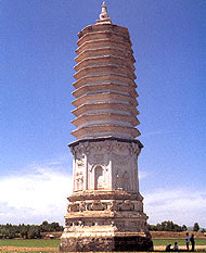 The pagoda is located on the site of the Liao Dynasty's middle capital in the county town of Ningcheng. In comparison with Daming Pagoda, which is commonly known as the Big Pagoda, it is called the Small Pagoda. The octagonal, multi-eaved, brick pagoda has thirteen storeys. Its huge first storey was supported by a double-girdled Sumeru pedestal. Carved on the main body and pedestal of the pagoda are statues of Buddha, bodhisattvas, celestial guardians, flying apsarases and other ornamental patterns. The first level of the pagoda eave has brick brackets and rafters, and the other levels above were built of bricks piled together. The pagoda steeple is in the shape of an inverted bowl of the Lamaist dagoba style. Built more than a thousand years ago, it is one of the most outstanding architectural masterpieces among the pagodas built in the Liao and Kin dynasties.